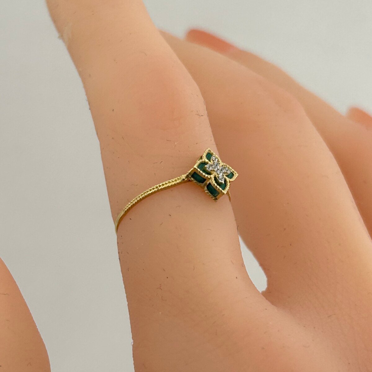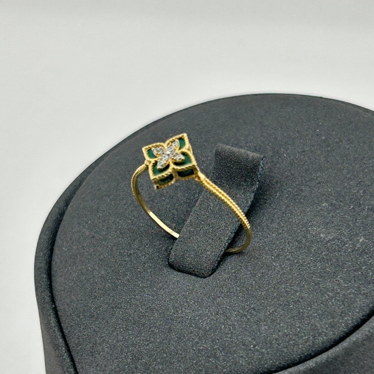 خاتم ذهب عيار 18 إيطالي بزخرفة خضراء أنيقة يعكس الذوق الرفيع ويمنحك حضورًا فريدًا. يتوسطه حجر زركون صغير بتصميم يشبه الزهرة، محاط بزخارف خضراء ناعمة تضيف لمسة غير مألوفة.