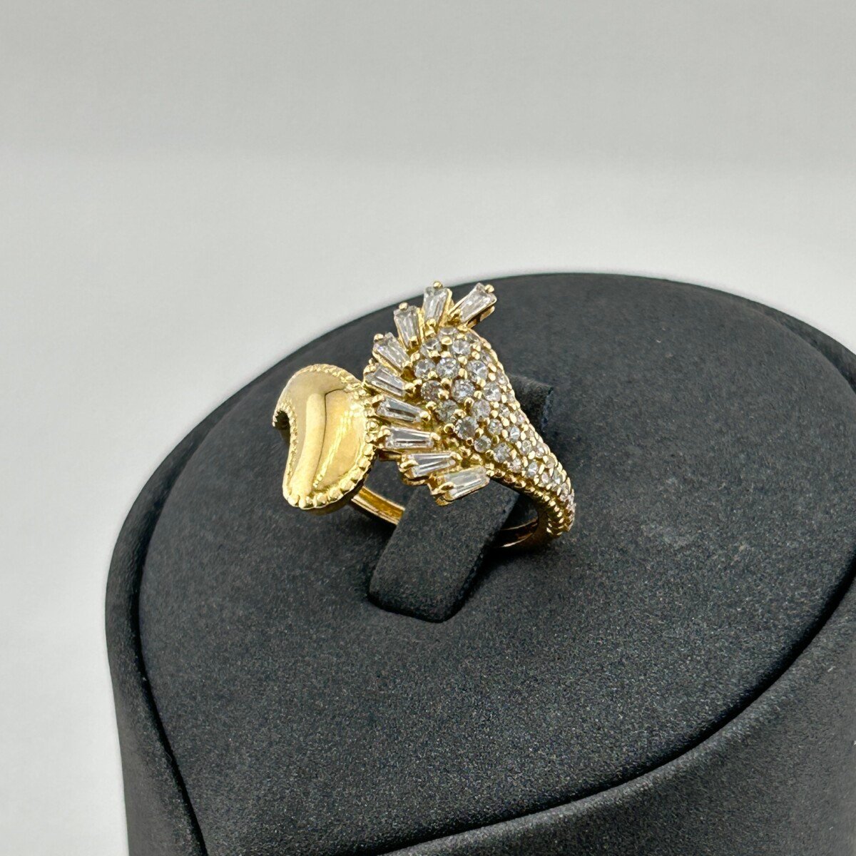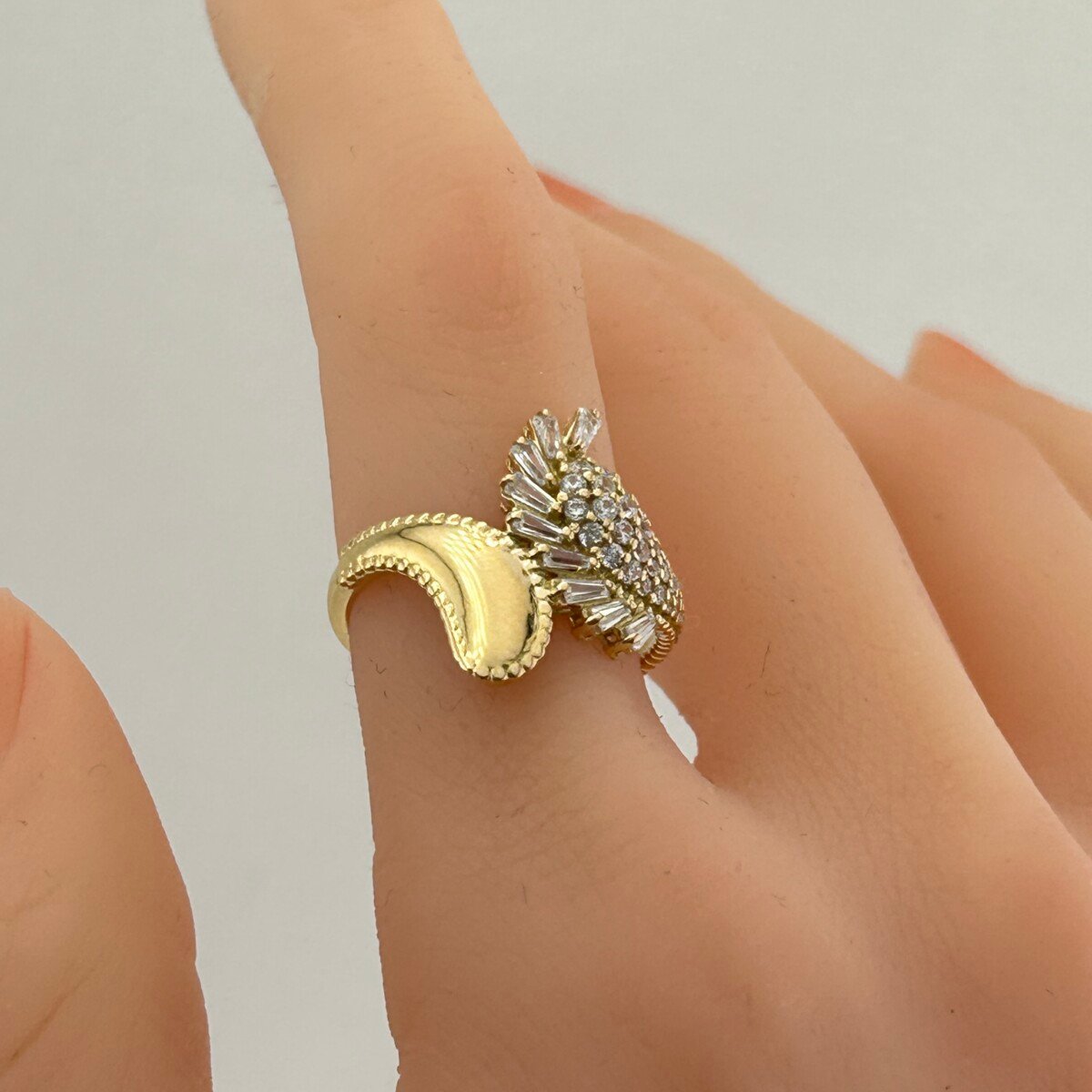 خاتم ذهب عيار 18 بترصيع قطري أنيق من جولدانا، يتميز بتكوين عصري يدمج البساطة بالجرأة. يمتد الترصيع القطري بفصوص زركون لامعة فوق قاعدة مكوّنة من كرات ذهبية دقيقة تمنح التصميم ملمسًا مميزًا وبعدًا بصريًا ثلاثي الأبعاد. تصميم استثنائي يجمع بين الحضور الفاخر والابتكار في التفاصيل.