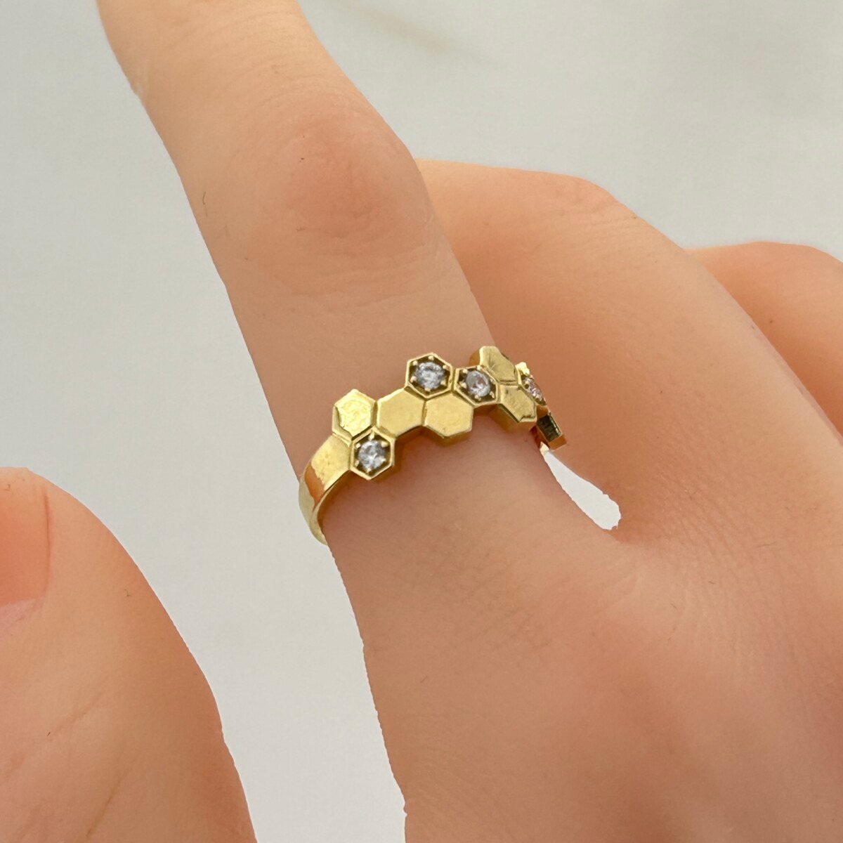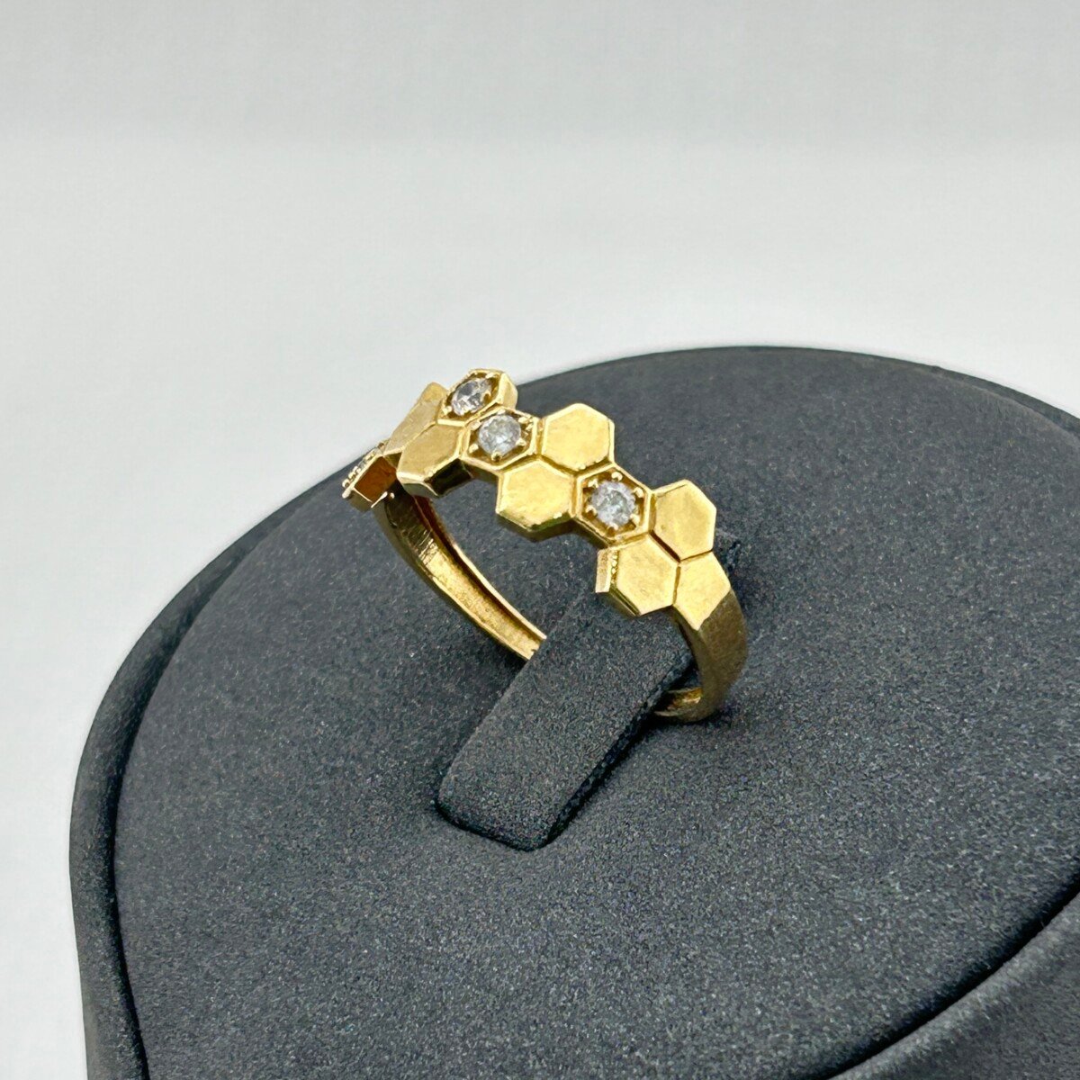 خاتم ذهب عيار 18 بتصميم سداسي مرصع هو خيارك الأمثل إذا كنتِ تبحثين عن لمسة هندسية أنيقة. يلفت النظر بخطوطه السداسية المتراصة والمزينة بزركون لامع يعكس الضوء ببريق راقٍ دون مبالغة. يعبر هذا التصميم عن الحداثة والفخامة في آن واحد، ليمنحك حضورًا عصريًا متوازنًا في جميع المناسبات.