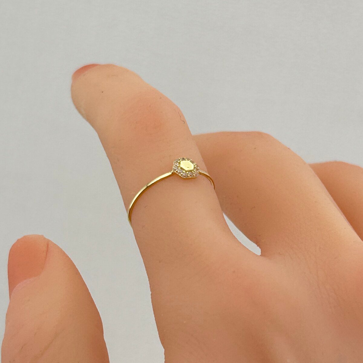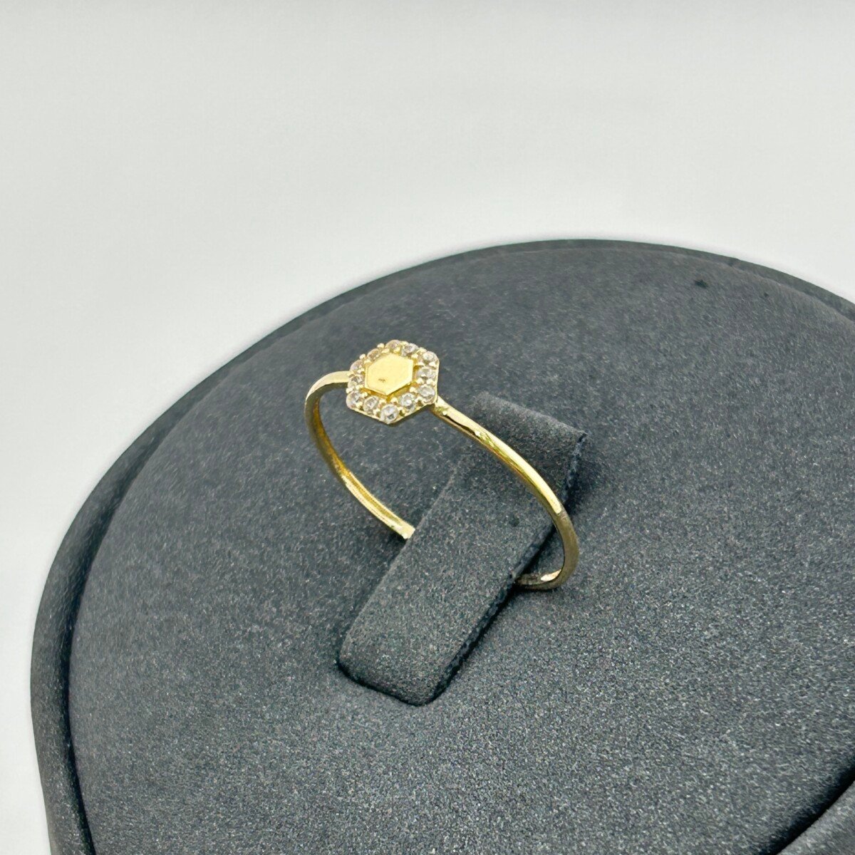 خاتم ذهب عيار 18 بتصميم سداسي زركوني ينبض بالأناقة الهندسية واللمسة العصرية. يتميز الخاتم بحجر سداسي يتوسط إطارًا من الزركونات الصغيرة البراقة، على قاعدة ذهبية ناعمة تضفي عليه إحساسًا بالتوازن والرقي.