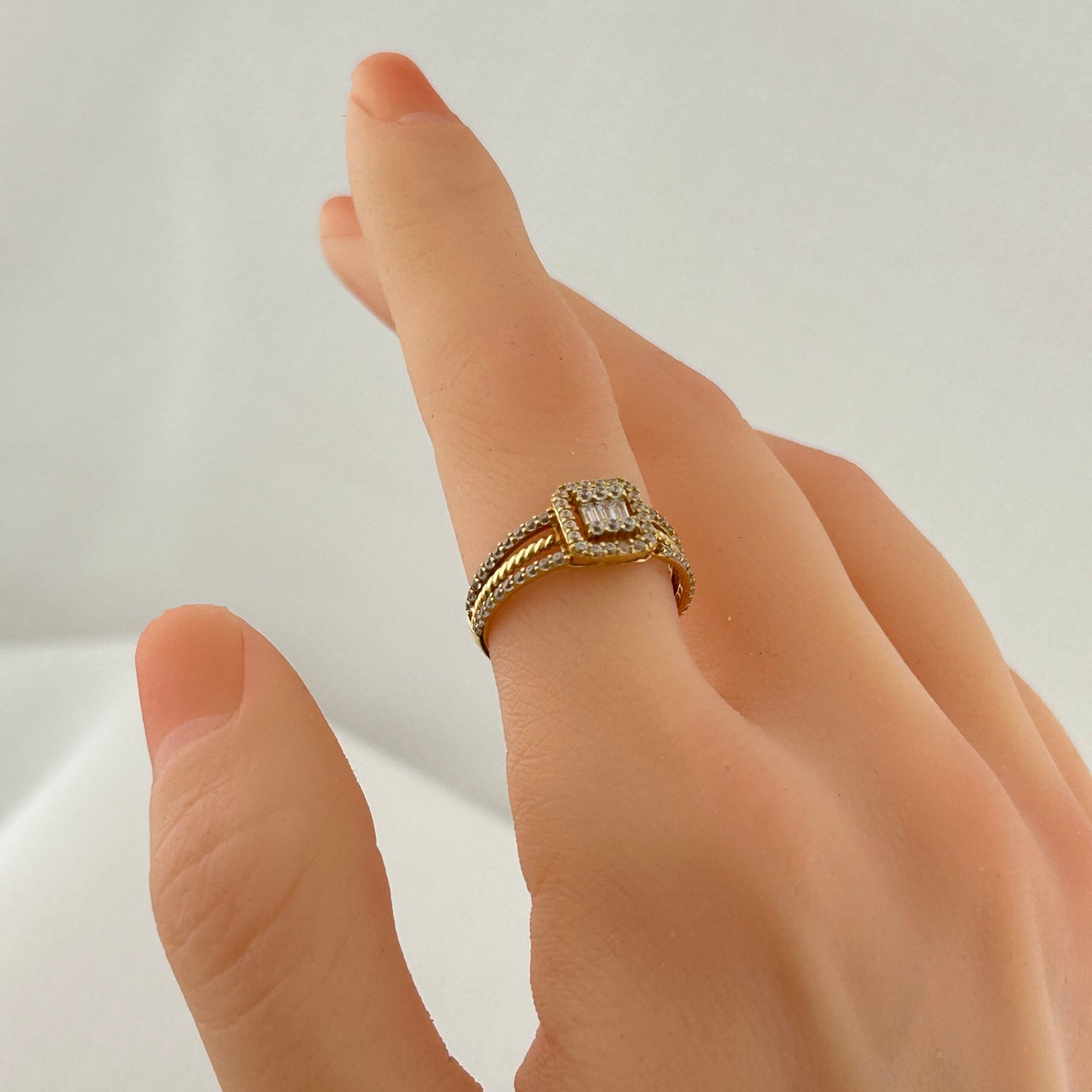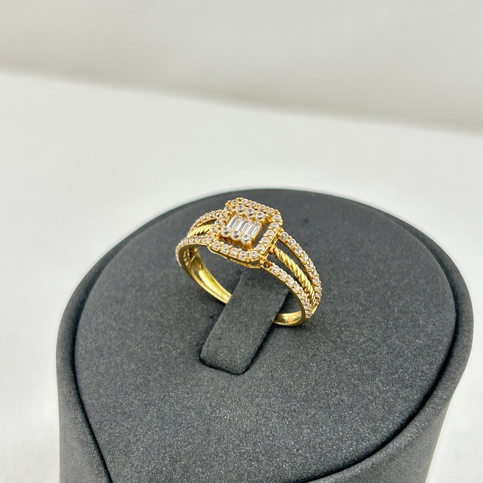 خاتم ذهب عيار 18 بتصميم فخم بفصوص مستطيلة مزدوجة تتوسطه لمعة متقنة داخل إطار ماسي راقٍ. الخطوط الهندسية تضيف توازنًا أنيقًا، بينما يضفي الترصيع الدقيق لمسة من الفخامة العصرية. مثالي لإطلالة مسائية تلفت الأنظار بثقة.