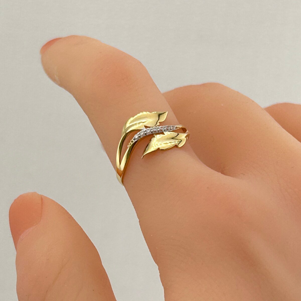 خاتم ذهب عيار 18 تصميم كلاسيكي بأوراق منحنية تضيف لمسة طبيعية راقية إلى إطلالتك. يضم الخاتم زخارف ذهبية تشبه الأوراق المتداخلة تتوسطها فصوص زركون لامعة، تمنحه حضورًا ناعمًا وفخمًا في آنٍ واحد.