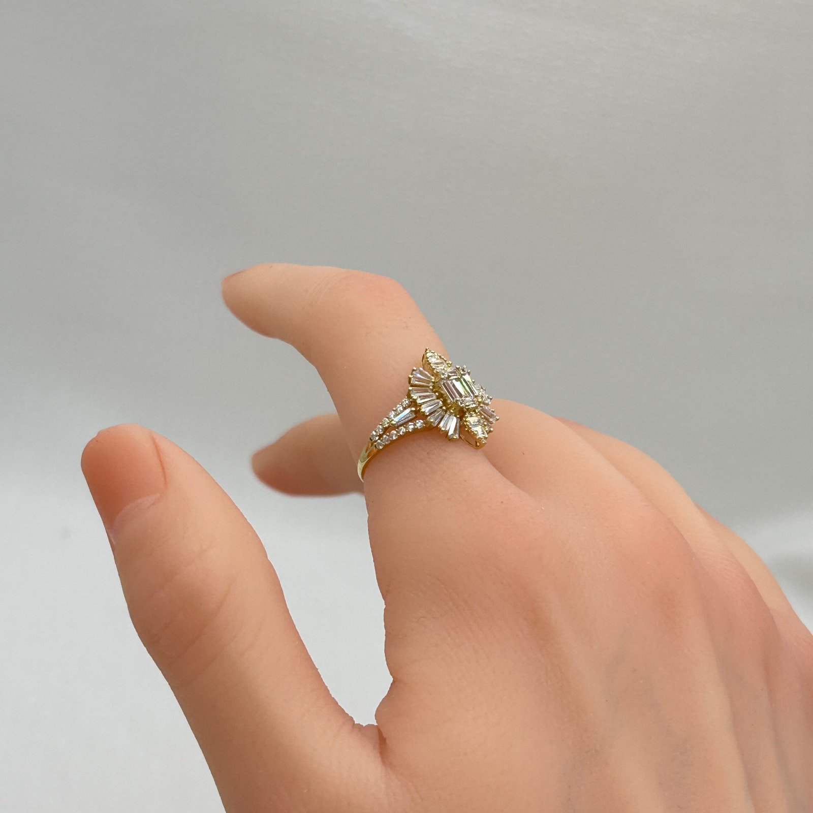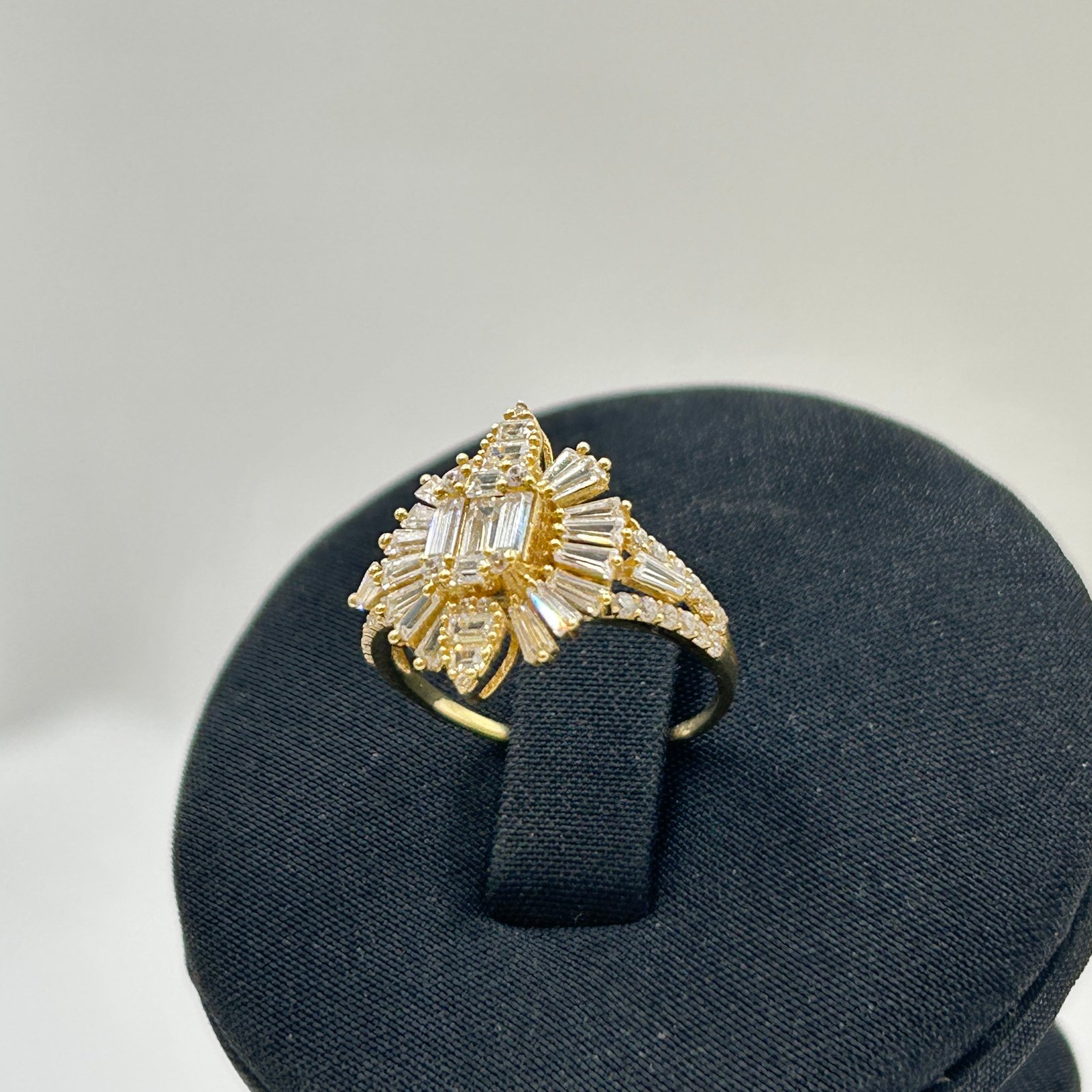 خاتم ذهب عيار 18 بفصوص زركون متألقة بشكل زهري يأسر العين بتصميم فاخر مستوحى من نجم زهري مرصوف بدقة. تتوزع الفصوص على شكل إشعاعات تنطلق من المركز لتعكس لمسة ملكية وأناقة فريدة. مثالي للمناسبات الراقية أو لمسة فاخرة يومية.