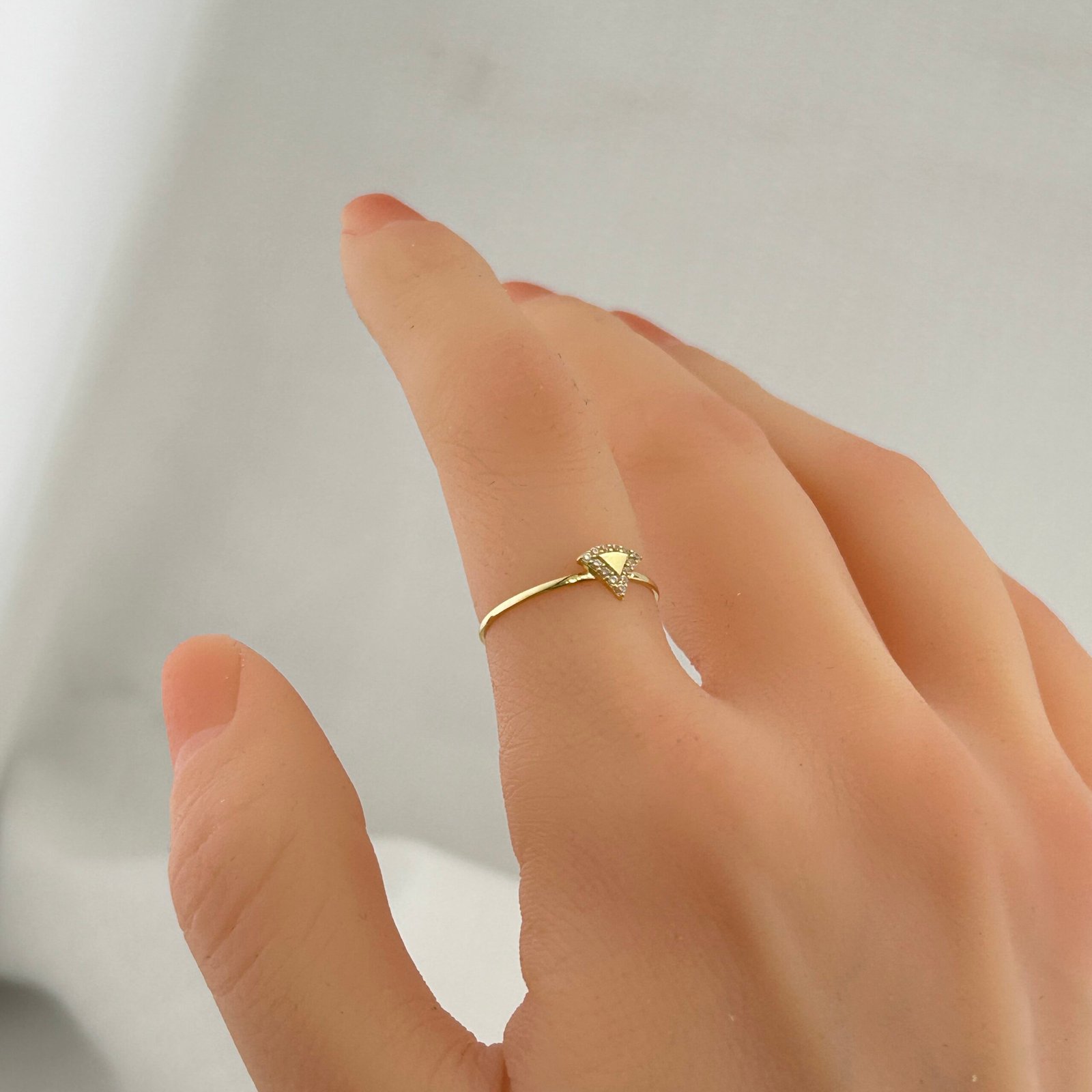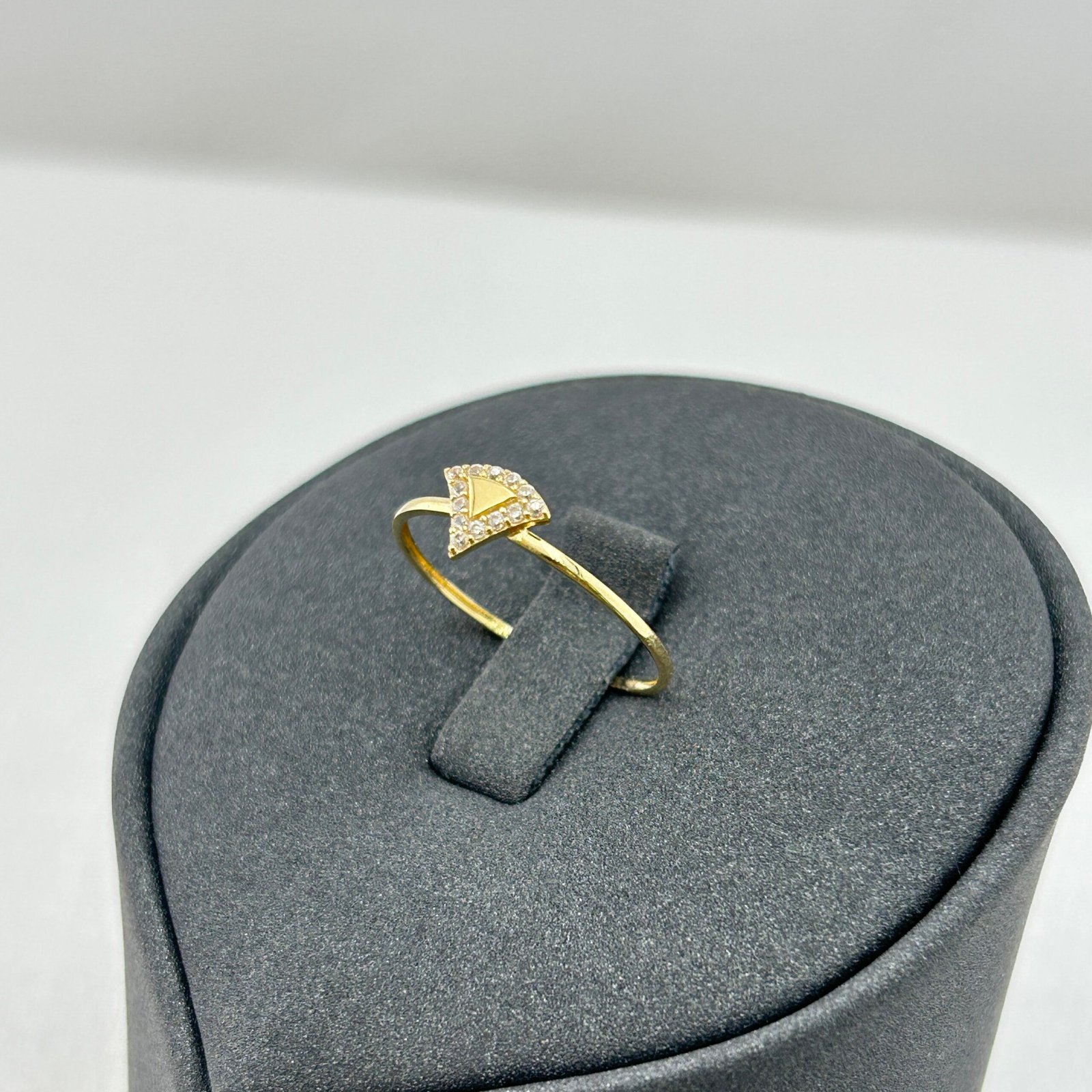 خاتم ذهب عيار 18 بتصميم مثلث متلألئ مرصع بفصوص زركون دقيقة تحيط بالمثلث الذهبي في تناغم فني يعكس الجرأة والأنوثة في آنٍ واحد. تصميمه العصري والمبتكر يجعل منه قطعة ملفتة لكل من تبحث عن لمسة خاصة تكمّل إطلالتها اليومية أو المسائية، ويزن 0.50 جرام فقط.